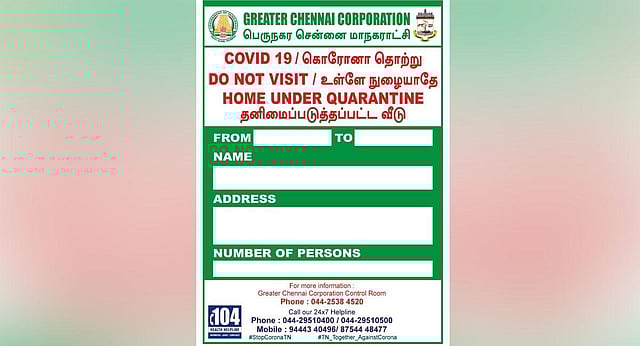 CHENNAI: The Chennai Corporation from today will begin pasting ‘alert’ stickers in houses where people are under home quarantine due to their travel history to affected countries or for having chronic breathing symptoms.