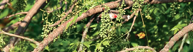 Another way of choosing birdfriendly plants is by looking at their source of food. Nectar constitutes the major food source of sunbirds, flowerpeckers, leafbirds etc., and a supplementary source for other bird families also. Bird-attracting flowers are usually red, day-flowering and have abundant nectar. Some of the plants with red, nectar-rich flowers are hibiscus, Indian coral tree (mullumurungai), red silk cotton (sevvilavu), and flame of the forest (purasu).