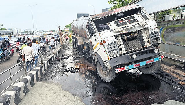 CHENNAI: Traffic was disturbed on Thiru Vi Ka bridge on Thursday morning as a truck carrying chemical products hit a median. According to police, the accident happened around 1.30 am. The truck was travelling from Puducherry, carrying a chemical used for manufacturing soaps.