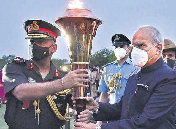 The Southern Victory Flame, a tribute to the war heroes of 1971, reached Chennai and was received by Tamil Nadu Governor Banwarilal Purohit.
