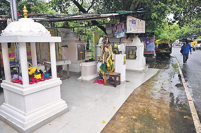 Sudhakar R, who lives around the corner, said a few people came up to his apartment, during the recently concluded Aadi festival, seeking funds for the temple. "They demanded a minimum of `500 and wouldn't leave the place," he said. The temple sits on the premises of the corporation park that is frequented by over 1,000 people every day. Many residents also park their cars and bikes in the premises. In addition, platforms are crucial walking spaces on this two-way road.