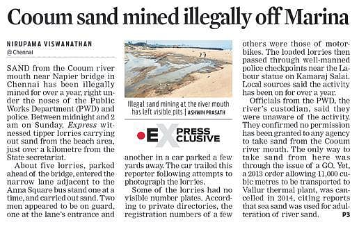 The petition by MR Thiyagarajan, president of Meenava Thanthai KR Selvaraj Kumar Meenava Nala Sangam, stated that the large scale illegal mining of sand from the area had caused severe degradation to the Coastal Regulation Zone (CRZ) and to the ecosystem, thereby posing a risk to the fishing community’s livelihood. The petitioner attached the TNIE article on the issue that was published on September 7.