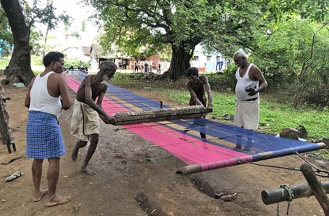 Time shoots up as Nagamani and Kaniappan make haste to spread out the day’s sheet of cotton yarn over the muddy ground off Girivala Road in Deshumugipettai. About a step or two away, tucked with lungis to the waist, Kuppan and Balakrishnan keep a close eye on their colleagues while their memories turn around to reflect upon a period when everyday life was a blend of smooth sail and competence. Nagamani and Kaniappan, in a trice, cross out bamboo woods on either end to hold the yarn sheet — corresponding perhaps to the size of a 22-yard-long cricket pitch — on air, while Kuppan soaks a cotton cloth with starch. Balakrishnan, in the midst, takes time out to make a deeply felt confession to TNIE: Sizing in the two villages would die in small doses with us and, “we have passed the time to attempt, let alone save the craft.”