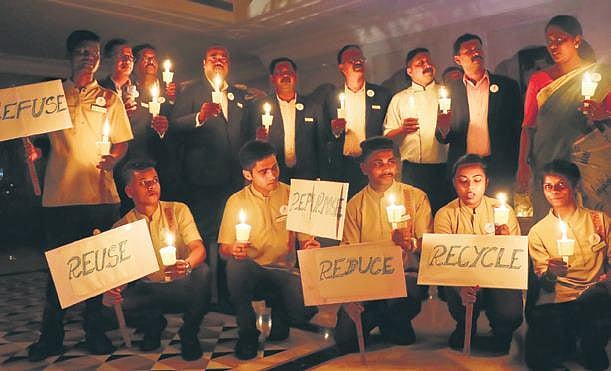 Upon realising that the symbolic activities were in commemoration of Earth Hour 2022, onlookers, too, joined in. When the lights came back, hotel management and staff took an oath, holding placards that spelt out the 5 R principles of environmental preservation — reduce, refuse, recycle, repurpose, reuse.