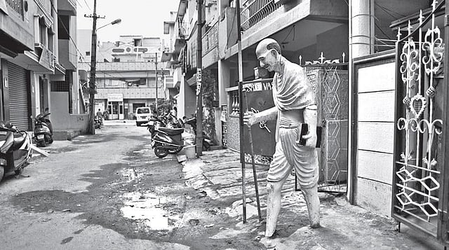 Using photography as his medium to make social commentaries, Bengaluru-based Vivek Vilasini has often incorporated Gandhi into several of his works. In Vernacular Chants, a series of nine photographs of Gandhi statues, taken in and around small towns and villages, none of the statues bear direct resemblance to the leader, the only consistency being the moustache and the bald head.