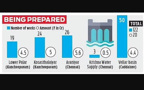 CHENNAI: Ahead of the northeast monsoon, the Water Resources Department (WRD) has commenced monsoon preparedness work at a cost of Rs 20 crore in Chennai region. About 122 projects will be implemented in Kancheepuram lower Palar basin, Tiruvallur Kosasthalaiyar basin, Chennai Araniyar basin and Krishna water supply scheme area, and Cuddalore Vellar basin. The works to be carried out on Cooum, Adyar, Buckingham Canal, Otteri Nullah, Virugambakkam Canal and river mouth and flood carrier drains will be completed by October-end, an official said.