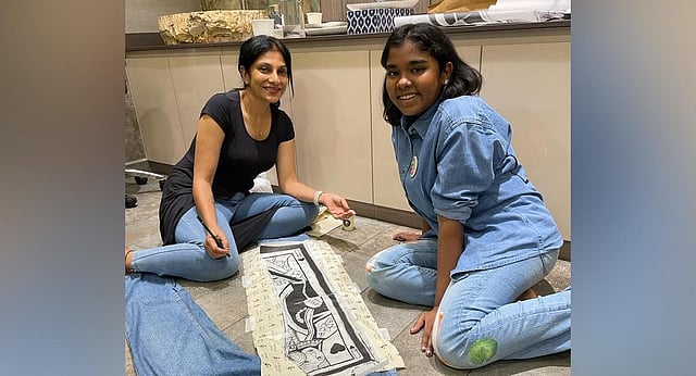 “Art helps us to grow and connect with ourselves, and be more realistic. This masterclass is meticulously planned and it takes different sessions to understand the intricacies of art. Diya, who is closely associated with the organisation, came up with the idea. She painted on a pair of denim jeans for her mother inspired by the Queen of Hearts collection from the House of Khaddar,” says Abinaya.