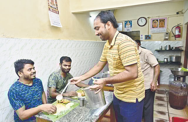 Commencing business in the early 1930s, the mess has completed 90 years of service. “We believe in providing quality food at a nominal price so the clients go home satisfied and happy. This core principle is also one of the reasons for us to sustain in this trade,” shares Manoj, son of Kumar. Rayar’s Mess is a family-run business and has seen four generations taking over the line of work. “My great-grandfather, Srinivasa Rao, began this eatery. We are followers of Raghavendra Swami; his followers are called Rayars. People called my great-grandfather Rayar, hence the name of the mess,” explains Manoj.