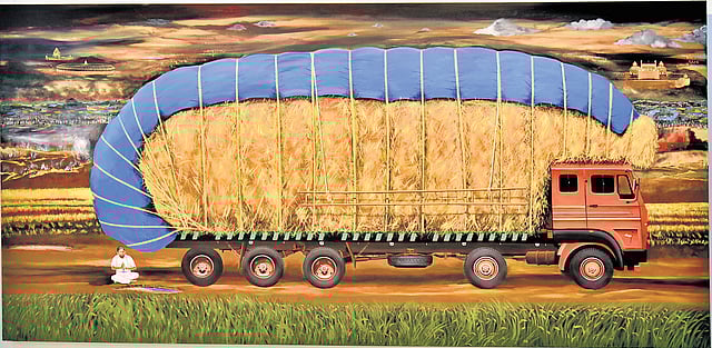 The main theme of this art exhibition is to capture globalisation. “Every sector is developing and making connections, not only in India but in other countries as well. This growth is similar to trucks that have high speed and travel through connecting roads,” the artiste explains. Trucks are usually seen as carriers of goods and essentials but in Sovan’s paintings, they also carry the weight of powerful visuals — the fight against inequality, the struggles of marginalised communities, and raising awareness about social issues.