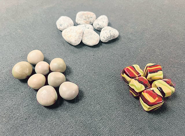 I played with the seeds and found them too round and light for my liking. I, however, remember my mother making small cloth pouches filled with rice to play these games safely. That could well be another option, especially in today’s homes with flooring that could get damaged with sharp-edged stones.