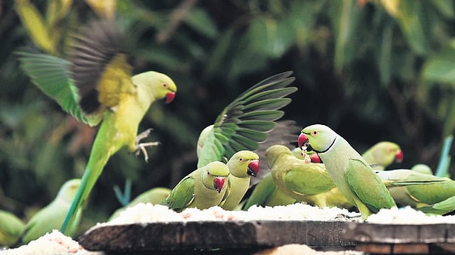 Rose-ringed parakeets — with their red beak, blue tail, loud ak ak sound and often found in large company — frequent the open area. “These parakeets have their position marked on the planks. They poop at a spot and mark their territory. If someone occupies the point, they fight with their beaks,” shares Sudarson, adding “They are my children.”