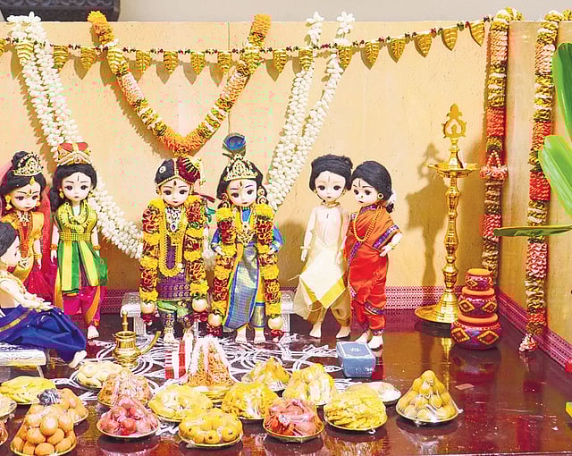 For those seeking a lesson on these texts and the unique female saint, look no further than Thejus Swarna Kolu. With the theme ‘Andal Thirukalyana Vaibhogame’, Shanthi Chandrasekar’s kolu of regal, handmade dolls — crafted with cotton, recycled material, and bits of cloth — carves a unique space in the city’s Navaratri celebrations.