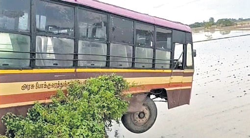 “While negotiating a stretch between Kattur and Thathaimanchi, the bus veered off the road, hit the lake bund wall, and one of its wheels slipped off, leaving the vehicle hanging with one side over the fields and the other on the road,” the police said.