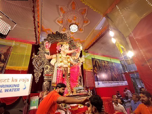 The idol was unveiled to the devotees on Tuesday night, where a procession covering the four streets surrounding Veerappan Street was held. “The homecoming of Bappa is called agaman, which is more like Diwali celebrations. We take him around with fireworks, music and dance, so that he could bless those who could not come visit him when he is stationed here at the street’s end before going for immersion, which is celebrated like one does Holi,” notes Kumar. The neon green cloth covering the pandal, white and pink garland decoration, and lights set up on the street is the “palace where the lord will bless his devotees.”
