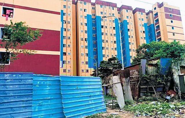 When TNIE visited the tenements, it was observed that nearly all overhead water storage areas on the terrace remain uncovered. Residents said that despite nearly three months since inauguration, many essential works remain incomplete. Unfinished windows without shutters allow rainwater to enter homes, unlocked houses that are yet to be occupied have also led to animals wandering in and soiling the interiors. Compound walls are still under construction, and the lifts require constant repairs.