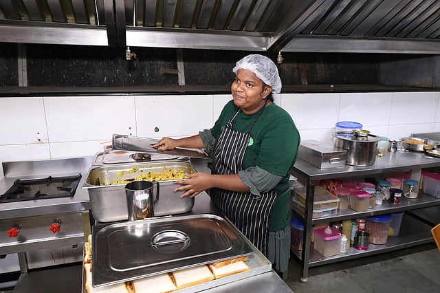 Chennai, however, demanded a wider talent pool. Applicants came in from Andhra Pradesh and Tamil Nadu, some with basic cooking skills but many without prior exposure to large kitchens, but with determination. The team here includes six visually impaired chefs, four sighted supervisors, and one manager. For Vennila, working here marks her first experience outside her home state, Andhra Pradesh. “I am feeling very happy,” she says. “At first it seemed difficult, but gradually it became easy.” She hopes her parents will feel proud seeing her being independent. Today she handles the kitchen as one of the main chefs, mainly preparing rice, noodles, French fries and manchurian gravy with confidence and ease.