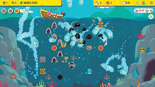 These bonks are completely random trigger elements on the board. Most triggers win you several points, all in pursuit of meeting the ultimate target. Let me paint you a picture here: a jump rope pushes your ball up, keeping your ball afloat for longer, and potentially pushing it to more high value bumpable items. Bonking a tree wins you a sweet $200. If you meet a “bread” bumpable, the ball carries it along to the very bottom of the pyramid to win a few extra points. And so it goes.