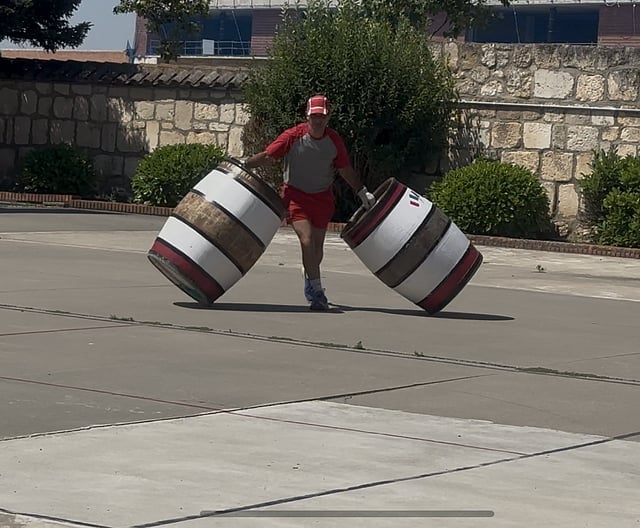 Another unusual game was demonstrated by a team from France — barrel rolling. These were giant barrels used to store wine and the team was rolling the barrels. Now, that sounds very simple, but imagine a large barrel lightly tipped on its side. You cannot let it stop and you need to keep it rolling. Their rolling was literally a dance with split-second timing — passing barrels to one another, weaving in and out.