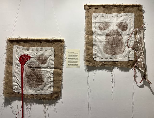 Besides 'Dark or Divine', is a mixed-media work made of jute (koni pai cloth), yarn thread, and a body print. In this piece, Yazhini connects two protests that happened a century apart in different parts of the world.