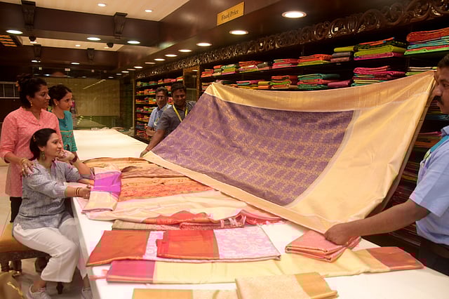 He also delves into how silk saris worn by Kollywood actors like Nayanthara and Jyothika are imitated with art silk and tester zari out of sheer demand to make them affordable. “The silk sari that Jyothika wore to the Ambani wedding was such a craze that I stocked up imitation saris and they were selling out quickly. I might have one or two more pieces left on the shelves. The actor must have spent lakhs on that sari but you can buy this tissue silk imitation at a price as low as `15 thousand,” he laughs.