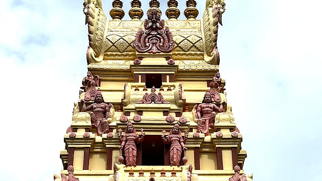 The tiny Karumanikka Perumal temple faces east with a modern three-storey gopuram in front. This leads to the bali-pitham and dvajastambham (flag- post), in front of which is the Garuda shrine facing the principal sanctum. Ahead is a modern mandapa in concrete with images of Dasavatara or ten incarnations of Vishnu. The presiding deity of this temple is a stone image of Karumanikka Perumal in a standing posture, with four hands, the upper two holding the Sankha and Chakra, while the lower right hand is in abhaya hasta (blessing devotees) and lower left hand is in kati hasta (resting on the hip). He is flanked by Goddess Sridevi and Bhudevi.