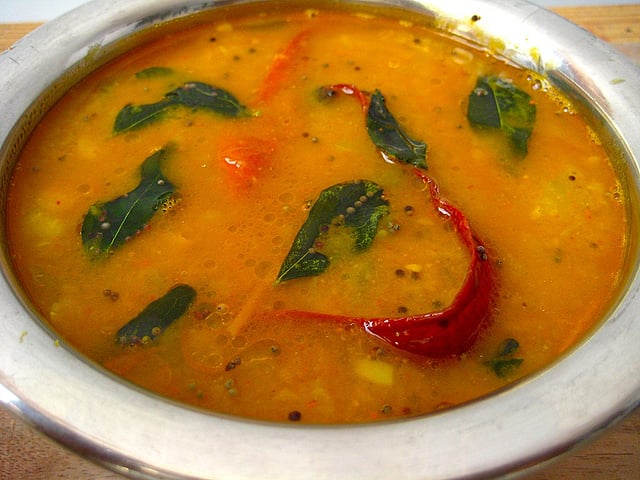 Tamil Nadu’s version is thick, rich, and made with freshly ground masala — none of that store-bought nonsense. This is the one that hits different at weddings, temples, and anywhere someone’s serving it with hot ghee on rice. Just bold flavours, perfectly balanced tanginess, and that one uncle saying, “Inga sambar vera level da!”