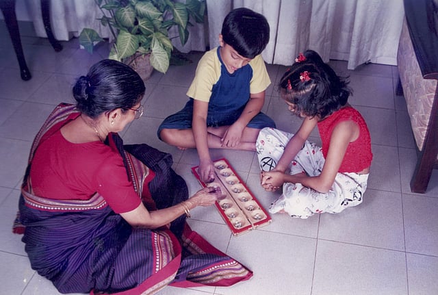 I didn’t realise that she was exposing them to a whole different aspect of Indian culture. I was vaguely familiar with these games. I remembered them in my fuzzy memories of childhood — of the family grouped around a board of Dhayakattam and the brass dice ringing on the floor, or an exciting game of Pallanguzhi accompanied by the excited screams and yells of my aunts and grandmother. It had never even occurred to me to bring these to the children.