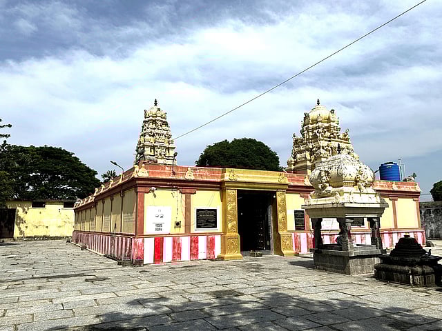 The Lingam, worshipped as Chidambareshwarar, enshrined in the principal sanctum, is small in size. The inner prakaram around this sanctum has images of Surya, Chandra, Nalvar (the three Nayanmars — Appar, Thirugnanasambandar, and Sundaramurti, and also Manikkavachakar); Subramanya with Valli and Devasena; Bhairava and others. The devakoshtas (niches on the outer walls of the sanctum) have Ganesha, Dakshinamurti, Maha Vishnu, Brahma, and Durga. The mandapam in front of this sanctum, of the Vijayanagara style of architecture, has some interesting sculptures on the pillars and a beautiful carved panel with images of various deities, including the Ashta-Dikpalakas (guardians of the eight directions) on the ceiling.