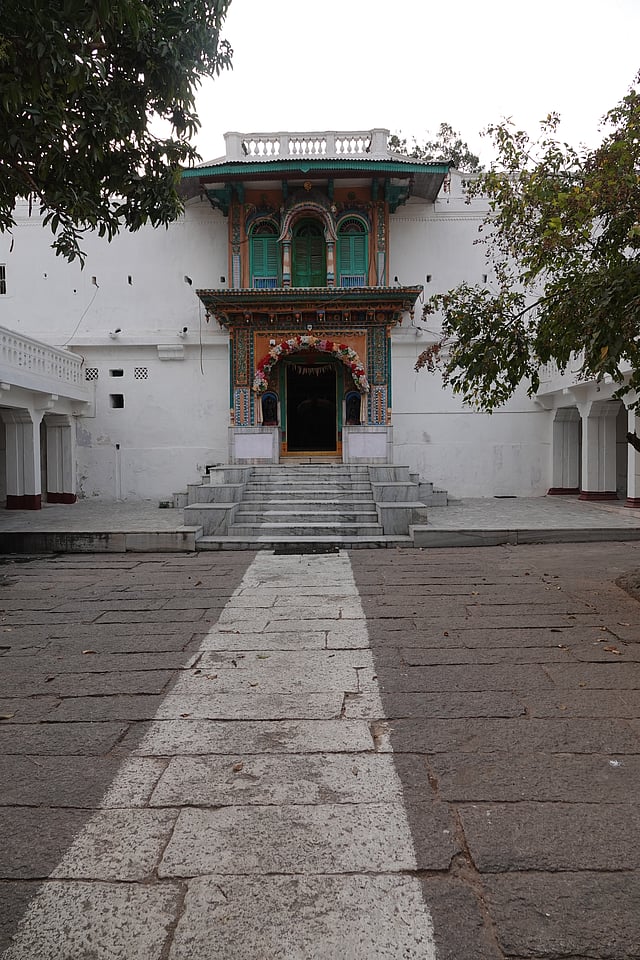 The Karmanghat Hanuman Temple is set in a busy and noisy area. However, when we entered its walls, the city seemed to disappear. It is believed to have been built in 1198, in response to a dream of the Kakatiya King Prola II. The temple is a blend of South Indian and Rajasthani architecture, with intricately carved pillars and vibrant sanctums. The tiles covered the floors, and orange paint covered what was left. We were shown an epigraph that had been left unpainted in order to protect it.