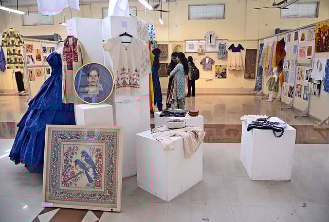 Across the venue, this diversity comes through. Sari borders carry motifs ranging from mythology to marine life, while sections on surface ornamentation bring together embroidery traditions from across India. Elsewhere, appliqué works, textile fibre art, and mixed-media installations extend the possibilities of fabric beyond conventional use. The exhibition also extends into varied explorations, including natural pigment paintings, functional products like bags and shirts, and experimental works such as primitive art-inspired designs.