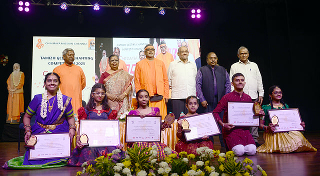 As the hall filled up on a Monday afternoon, students were already seated cross-legged on stage. As they sang devotional songs, their voices accompanied by the hum of the sruthi box. A few in the audience unconsciously tapped along to the talam. The serene atmosphere set the tone for the Tamizh Geetha Chanting Competition 2025 prize distribution ceremony. Organised by Chinmaya Mission Chennai at Chinmaya Vidyalaya, Taylors Road, the event brought together 28 finalists studying in classes 3-9. from across the state. TNIE was the media partner.