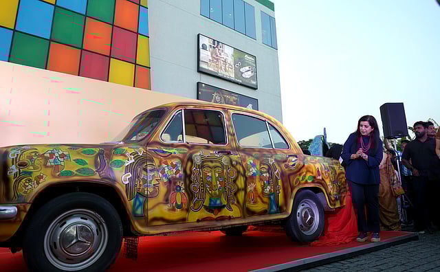 Enter the mall, and you walk through a 10-foot installation titled PORTALS created by Art Kingdom (in collaboration with UNESCO), an arch made with 250 kg of waste collected from the city’s shoreline. It serves as a reminder of the incessant littering in public spaces. Walk further, and The Kala Car comes into sight. Evoking nostalgia, this colourful creation is done on an Ambassador by artist Saravanan Senathipathi from the Cholamandal Artists’ Village. The installation comes to life with paintings of tribal faces with subtle colour play. The idea, he says, was to “Transfer movement into art, taking creativity beyond the canvas and into public space as it symbolises how art can travel, connect people, and spark a conversation wherever it goes.”