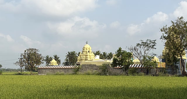 This east facing temple has a modern gopuram which opens on to a prakaram (enclosure) with the bali-pitham and Nandi mandapam. There is a pierced stone window in front of Nandi through which the vahana of Siva can have a darshan of his favourite deity, enshrined in the principal sanctum. On either sides of this window are tiny stone sculptures of two Nayanmars (important devotees of God Siva), namely, Appar and Thirugnanasambandar.