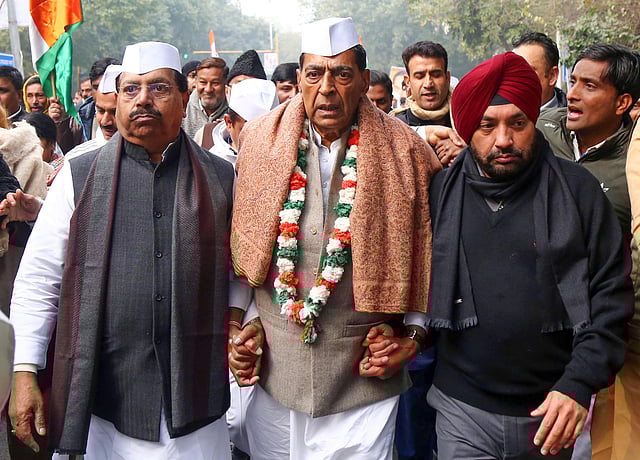 The Congress leaders and workers first marched to Ambedkar Stadium where they garlanded a portrait of Dr Bhimrao Ambedkar and then moved forward to the Rajghat to pay homage to Mahatma Gandhi's memorial.