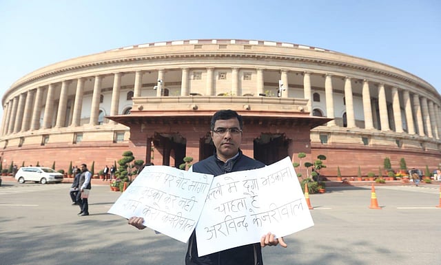 He was seen sitting in front of the Gandhi statue in Parliament holding a placard that read, "Shaheen Bagh shooter Kapil (Gujjar) is an AAP worker."