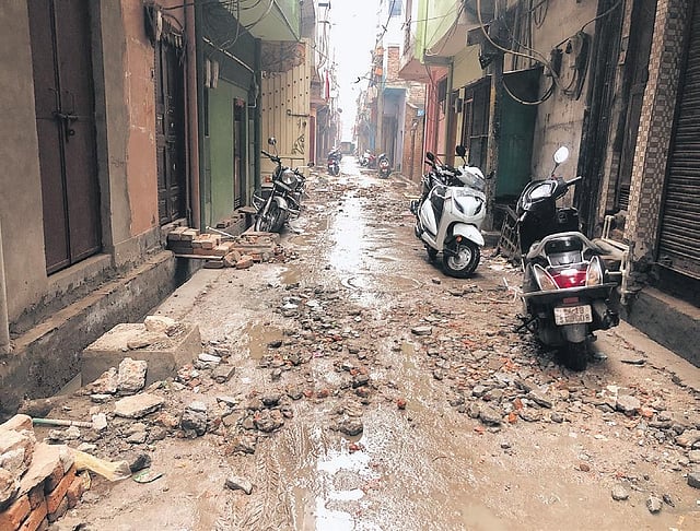 “What has happened is that to fix the drains they’ve dug up the road. Mounds of muck and broken bricks have been left on the side of the road, which in turn have narrowed its width. Not a single four-wheeler can pass through the lane,” said Azam Khan, a local.