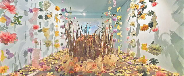 Titled as is Mist, So is Dew Destiny: Impermanence portrays this romance between the protagonists with the use of fibre paper to represent the attractiveness, fragility, beauty and impermanence of love. Hwa, who has been learning flower arrangement for over two years, said, “This exhibition helped us indulge in teamwork. We began our preparations months ago. Mostly homemakers and spouses of expats working in India join these classes.”