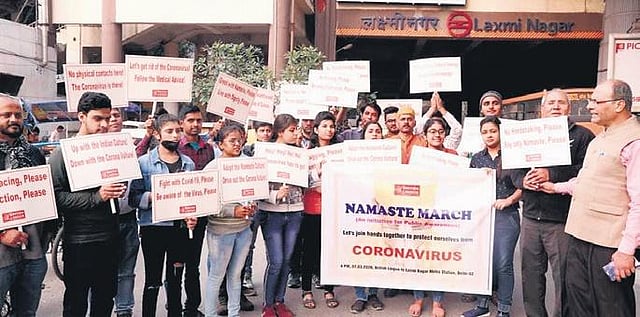 The march witnessed youth carrying placards with their hands folded in a namaste. The marchers appealed to all passers-by to adopt the Indian way of salutation when greeting others.