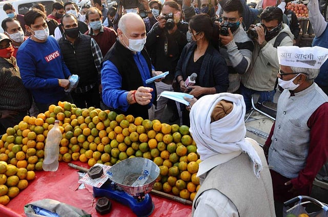Deputy Chief Minister Manish Sisodia distributes free masks among people at Vinod Nagar Market in East Delhi. (Photo | PTI)
