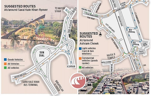 As per the suggested route plan, all vehicles going towards Sarita Vihar, Faridabad, Badarpur towards Ashram via Moolchand flyover will have to take a right turn under the Lajpat Nagar flyover onto Captain Gaur Marg. The commuters have been asked to take the left loop across the Modi Mill flyover and descend onto Mathura Road near Sukhdev Vihar to continue their journey.
