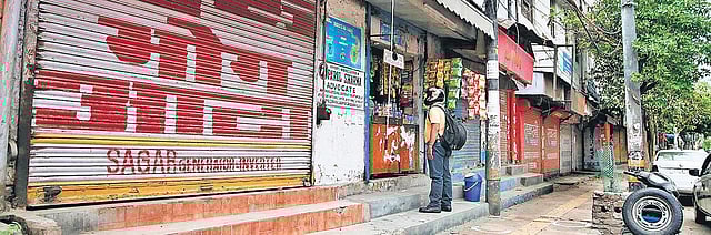 Only grocery shops were open at Anand Parvat Area but other shops decided to keep their shutters down on Sunday (Photo | Anil Shakya, EPS)