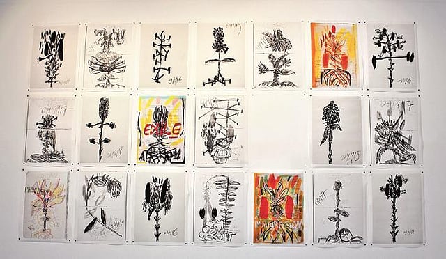 On walking into the gallery, Dadoune’s video piece titled ‘In the Desert’, which depicts a barren desert landscape where cypress and palm trees are being buried, is the first thing to catch one’s eye. To its right there are flowers sketches, intersected with a set of two video installations. The footage shows, in sequence, a small, provincial Israeli town, and the artist himself suspended above the ground with cables. Dadoune said, “I started to see how the desert was erased by the massive construction project in the Middle East... The series of black flowers expresses human fragility in times of war in Tel Aviv.”