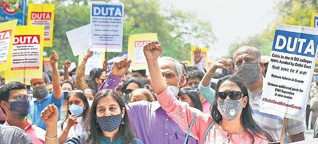 NEW DELHI: As Delhi University teachers intensified their protest over the non-payment of salaries and other issues, the Delhi Chief Minister Arvind Kejriwal called a meeting of all principals and chairman of governing bodies of the 12 fully-funded colleges to discuss their issues. The teachers led by the Delhi University Teachers’ Association (DUTA) are protesting over non-payment of salaries and non-issuance of pensions and medical bills for the last five days. Intensifying their stir, thousands of teachers took to the streets on Monday. The “Adhikar Rally” was held from Delhi University VC office to the Chief Minister’s office against the government’s “arbitrary and unreasonable” stance towards these 12 colleges. Besides the teaching faculty, the march was largely joined by the staff, students and other non-teaching faculties and members of the Delhi University Principal Association (DUPA).
