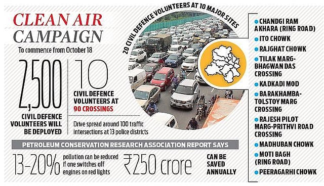 As per the break-up, 10 volunteers each will be deployed at 90 intersections and 20 environmental marshals each will be deployed at the 10 major intersections of the city. He said these Civil Defence Volunteers will work as ‘Paryavaran Marshals’ and also hand out pamphlets carrying information regarding Chief Minister Arvind Kejriwal’s three appeals to the public.