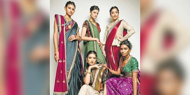 When one sees Damayanti and other ladies wandering around, they are mostly seen in beautiful silken drapes. Those drapes play a huge role in making them seem graceful as a swan while they are walking. It is also the clothes that add to the beauty of the paintings. We’ve played around quite a bit with the texture on the skirts. There are beautiful two piece sari sets and drapes, etc. So, we haven’t tried to diverge too much from our muse and have kept alive the essence of the artist’s body of work.