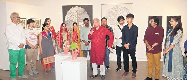 These are a part of Prakrut, a group exhibition that features the works of young tribal artists from various parts of India eight Northeastern states along with Maharashtra, Madhya Pradesh, and Bihar ongoing at the gallery till Sunday. Presented by The Raza Foundation and curated by Bhopal-based artist and curator Akhilesh, this exhibition offers a glimpse of the cultural and artistic practices of a few Indian tribal groups. “I focused on parts of Northeast and South particularly because most of the tribal art shown here—in this part of the country—is North Indian. I tried to represent as many states as I could through this exhibition,” mentioned Akhilesh.