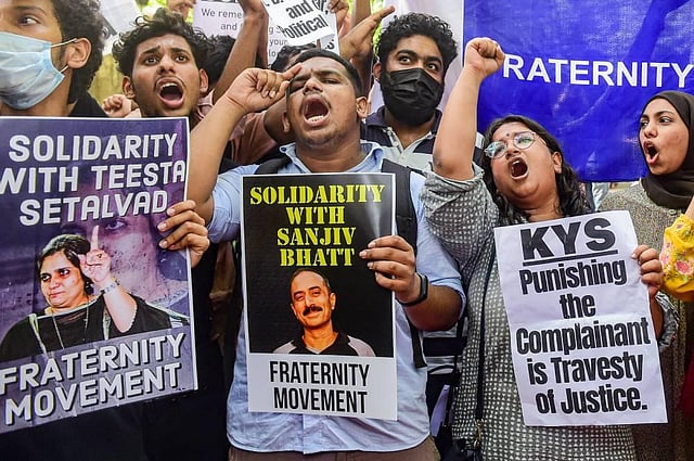 Around 300 protesters gathered at Jantar Mantar and raised slogans demanding the release of Setalvad and former IPS officers R B Sreekumar and Sanjiv Bhatt, who have been accused of "criminal conspiracy, forgery and placing false evidence in court to frame innocent people" in the 2002 Gujarat riots.