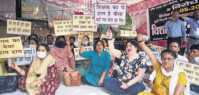 NEW DELHI: Over a thousand teachers along with other staff employed with the East Delhi Municipal Corporation (EDMC) sat on a mass ‘dharna’ before the civic body headquarters at Udyog Sadan, Patparganj, demanding their salaries pending for the past five months.