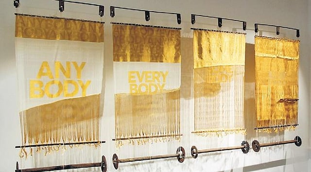 Krishnamachari has, interestingly, curated works created only by female artists—a decision that lends a feminist perspective to this exhibition. A glimpse of this approach is particularly visible in artist Lakshmi Madhavan’s ‘Hanging by a Thread II, (2022)’, the second work in a two-part series. Here, Madhavan explores layers of identity through the memory of her late grandmother. The artist’s principal works have been created using the kasavu mundu veshti—a traditional white and gold saree worn by women in Kerala—that Madhavan’s grandmother donned throughout her lifetime.