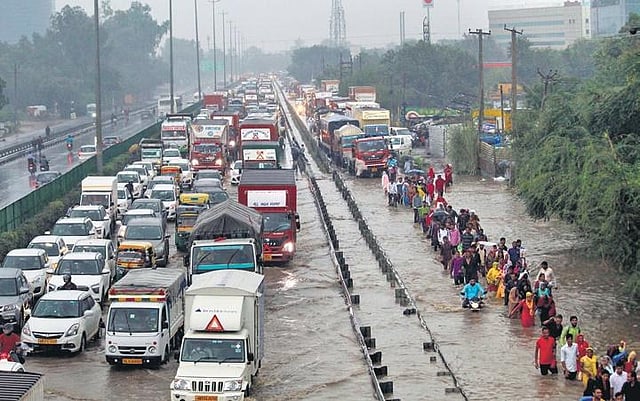 The traffic moved at a snail’s pace on the Delhi-Jaipur National Highway, Signature Tower Flyover and Hero Honda Chowk due to waterlogging.